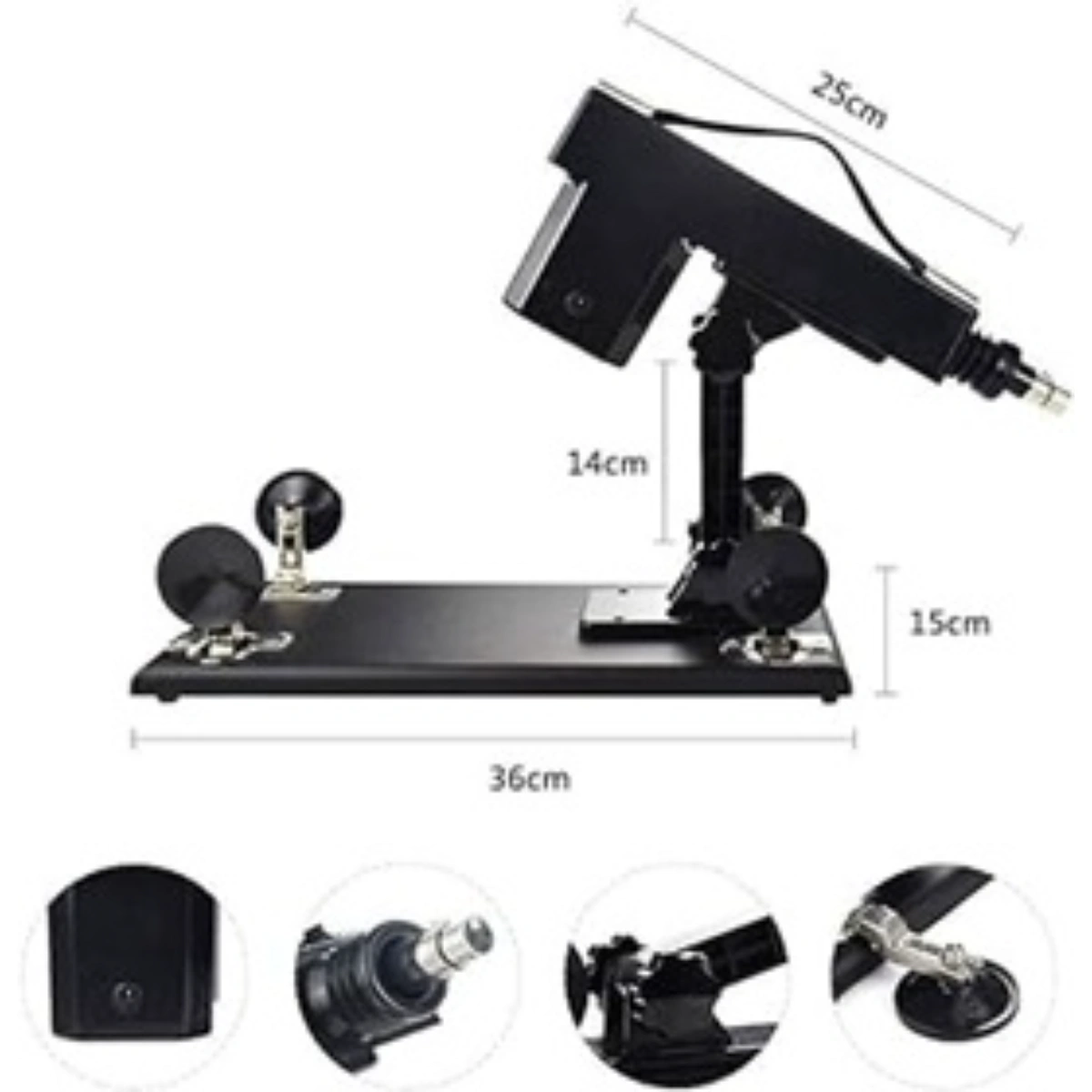 ✔ Largo total: 38 cm. ✔ Diámetro: 14 cm. ✔ Power control. ✔ 11 velocidades de 3 VA 24V. ✔ 4 chupas adherentes. ✔ Dildo: ✔ Largo total: 26 cm. ✔ Insertable: 18 cm. ✔ Diámetro: 4 cm.